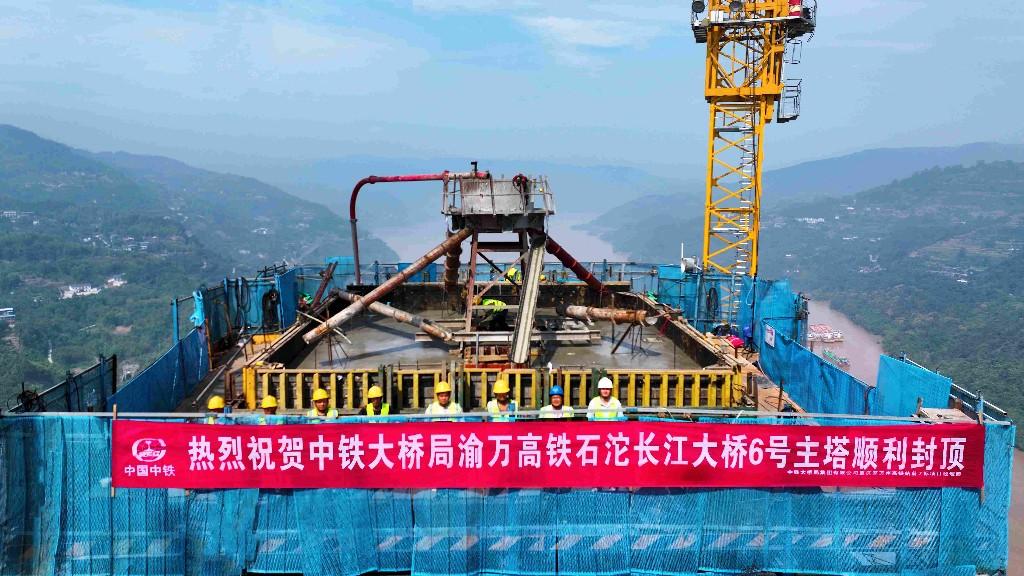 石沱长江大桥位于重庆市涪陵区,是渝万高铁全线控制性工程,由渝万铁路有限责任公司建设管理,中铁大桥局承建。该桥主桥全长1056米,主跨608米,首次采用公铁合建双联塔、公铁同层分幅主梁的新时代桥梁,其6号主塔高253米,是世界最高双联主塔。