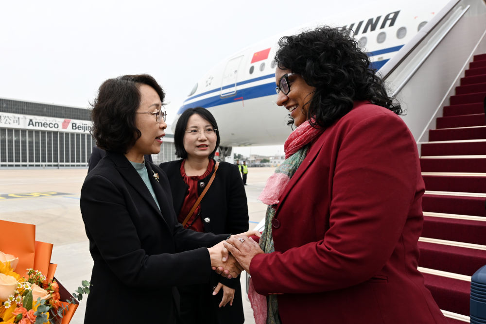 10月12日,来华出席全球妇女峰会的斯里兰卡总理阿马拉苏里亚抵达北京。