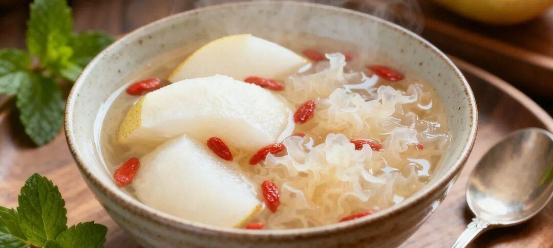做法:银耳冷水泡发1-2小时,去蒂撕成小朵;雪梨去皮切块;红枣去核;枸杞温水泡软。锅中加水(约600ml),放入银耳大火煮沸,转小火炖30分钟至出胶。加入雪梨块、红枣、冰糖,续炖10-15分钟。关火前五分钟加枸杞,搅拌至糖溶化。