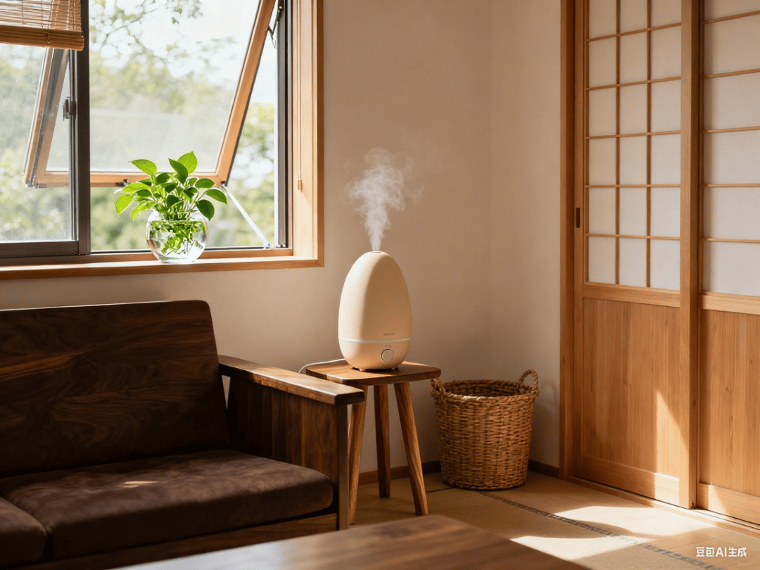 维持室内45%-55%湿度,水培绿萝与超声波加湿器协同作用;