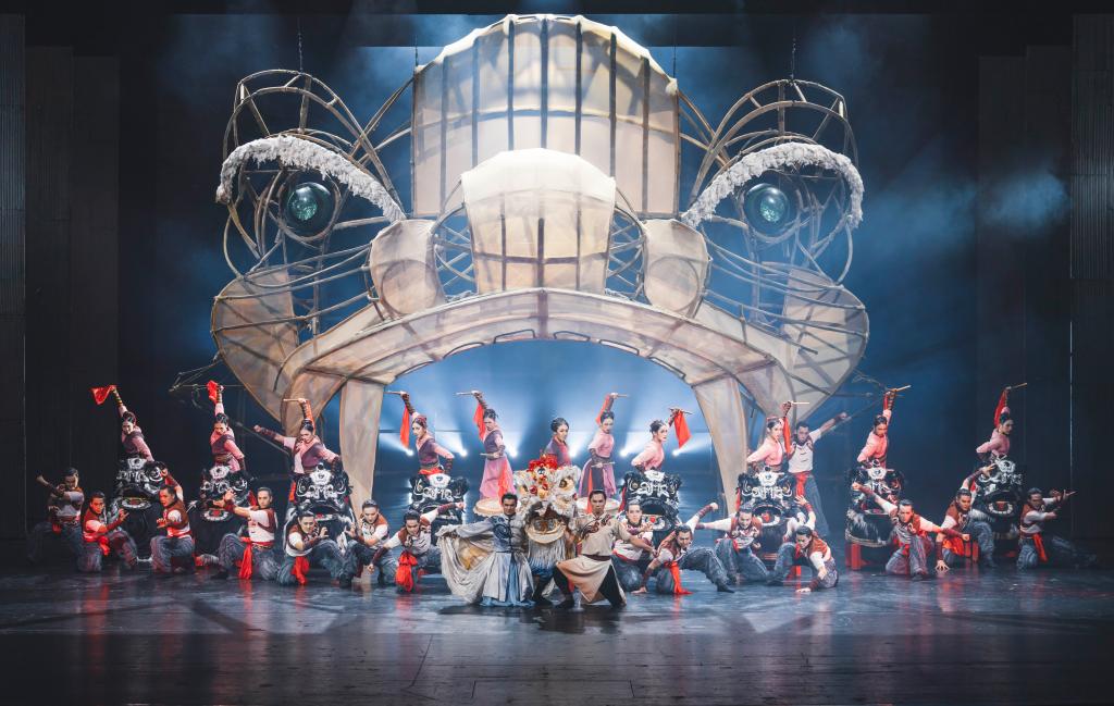 1月10日至11日,由广州歌舞剧院创排的舞剧《醒·狮》在醒狮起源地广东佛山巡演。18名男演员舞起9头威风凛凛的醒狮,站上鼓面向前迈进。霎时,灯光熄灭,舞台上出现了用竹片龙骨架搭建的巨型醒狮造型,它睁开双眼,目光如炬,全场掌声雷动、一片惊呼。